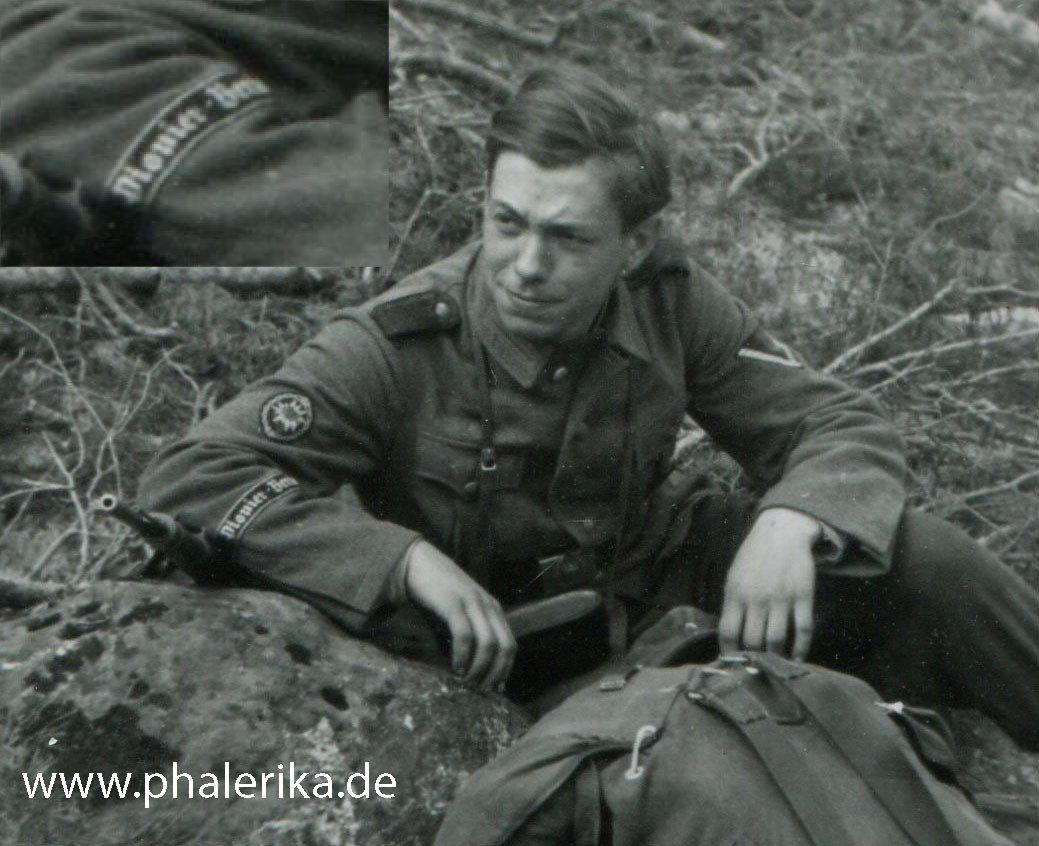 Ärmelstreifen "Pionier Berichter" des Gebirgs-Pionierbataillons 99 in Lappland getragen. Sonstige Umstände unbekannt. Ein schönes Belegfoto für einen bisher unbekannten Ärmelstreifen.