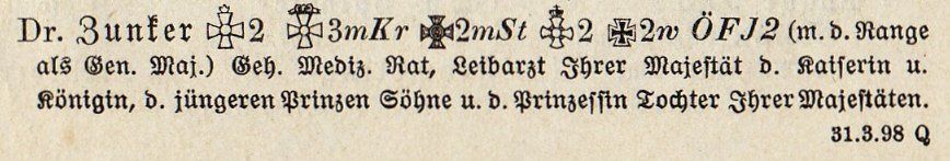 Die abgebildete Person kann auf Grund der einmaligen Kombination der getragenen Orden als der Generalarzt und Geheime Medizinalrat Dr. Ernst Zunker, Leibarzt der Kaiserin und Königin Auguste Viktoria identifiziert werden. Die auf der Portraitaufnahme zu erkennenden Auszeichnungen lassen sich in der im Auszug abgebildeten Rangliste der Preußischen Armee von 1906 erstmalig in dieser Kombination nachweisen. Laut Königlich Preußischer Ordensliste (6. Nachtrag der Liste von 1905) wurde Zunker am 27. Januar 1911 mit dem Stern mit Eichenlaub zur 2. Klasse des Roten Adlerordens beliehen. Da dieser Orden auf dem Foto noch fehlt, muss die Aufnahme zwischen 1906 und 1910 entstanden sein.