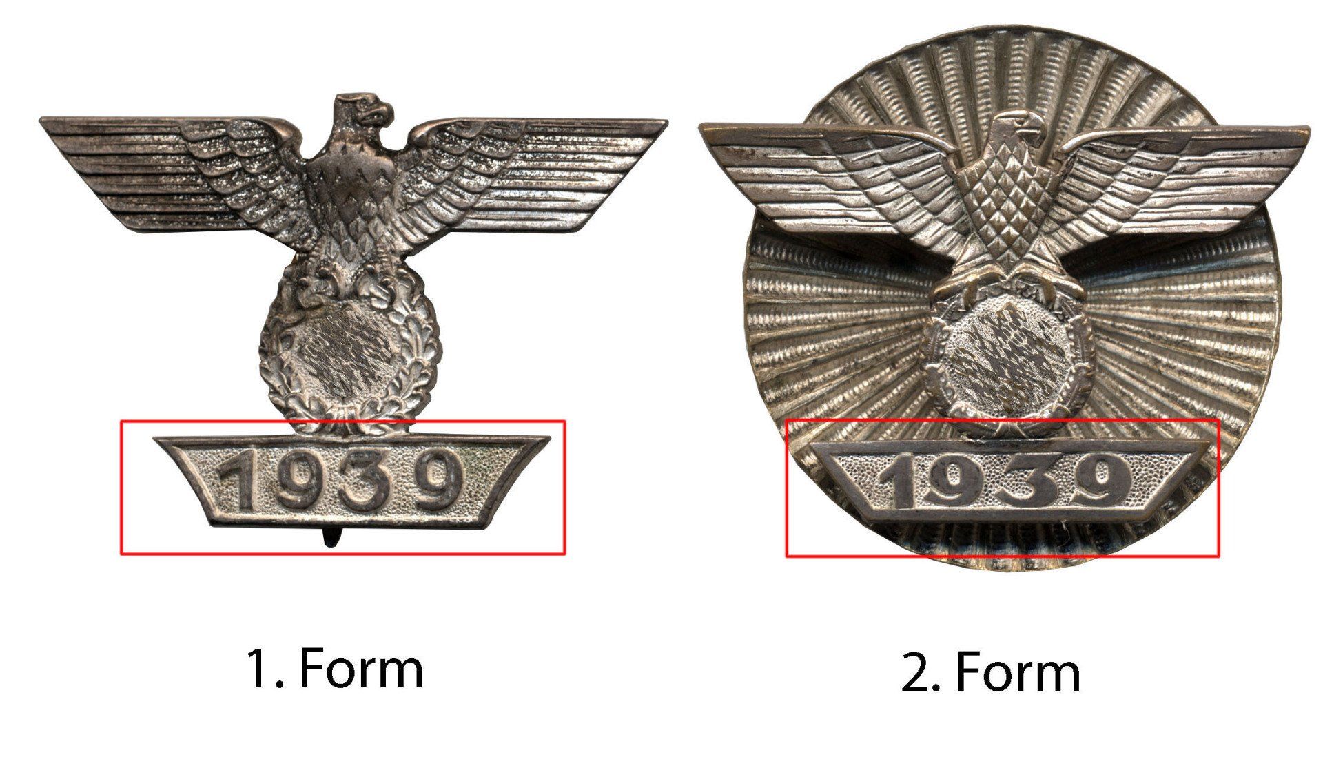 Bei den Wiederholunggspangen für das Eiserne Kreuz gibt es die 1. und die 2. Form. Unabhängig davon ob es sich um die 1. oder 2. Klasse handelt, ob an Schraubscheibe, oder Nadelsystem. Grund für die Unterscheidung sind die Datumsfelder mit der Jahreszahl 1939. Bei der ersten Form sind die seitlichen Kanten abgerundet, bei der 2. Form ist dies nicht der Fall.