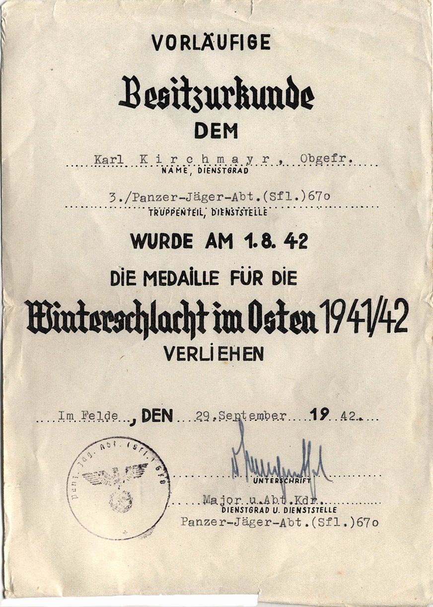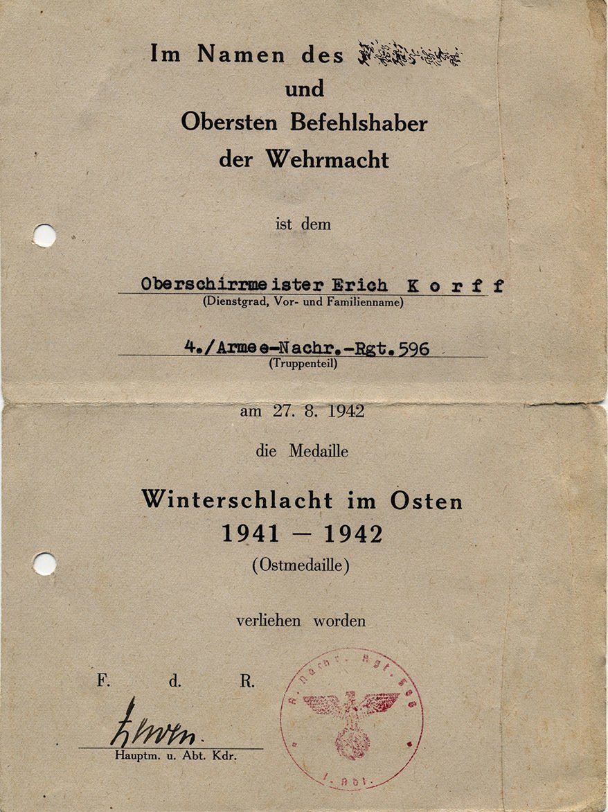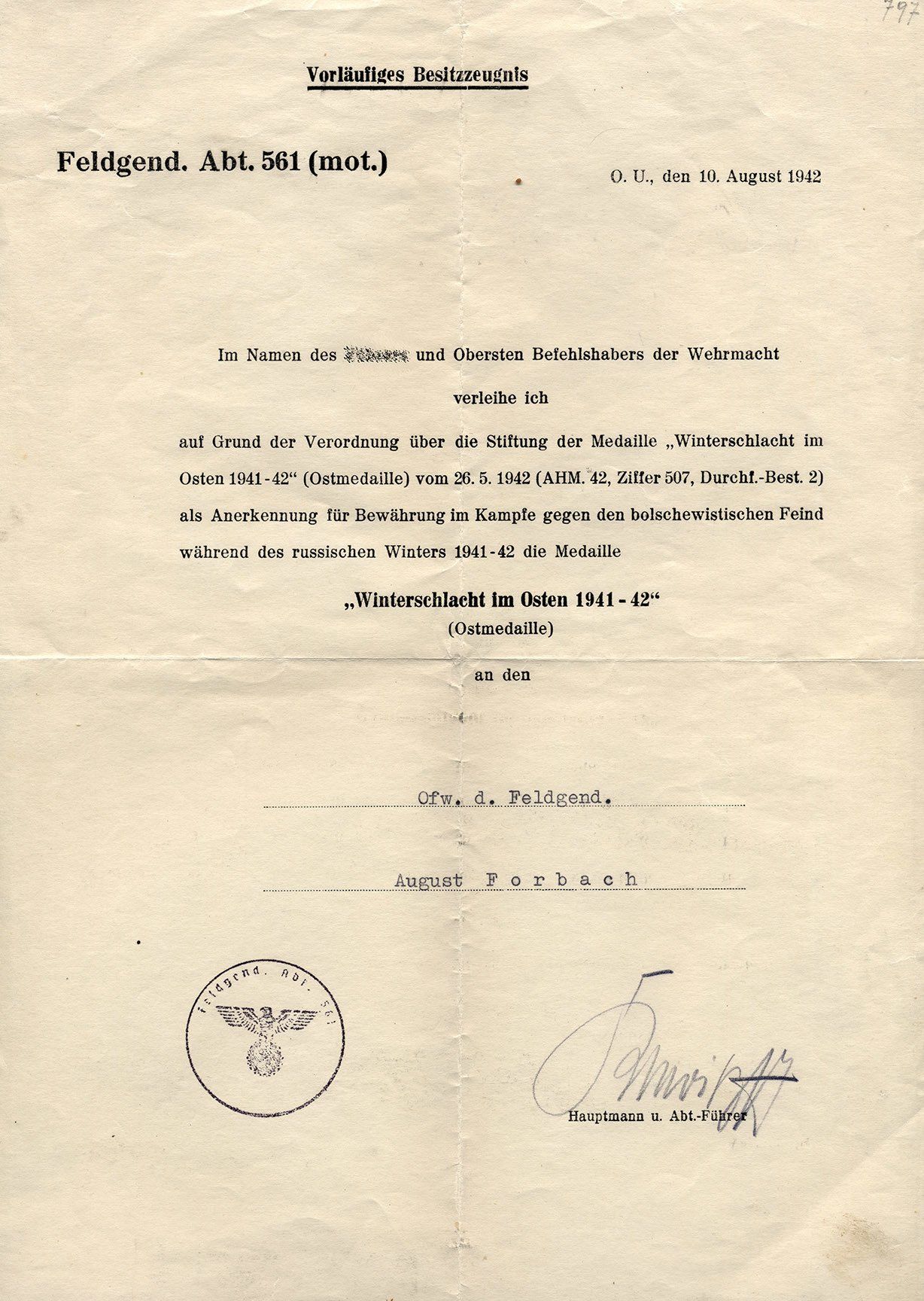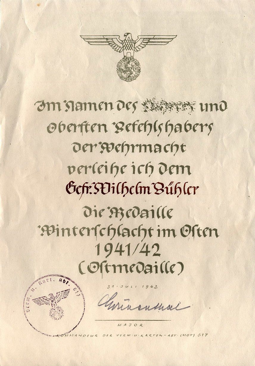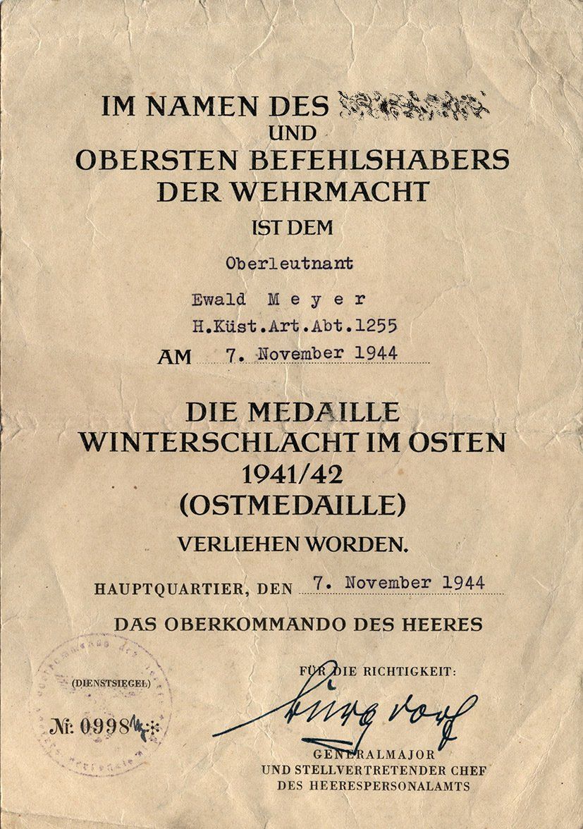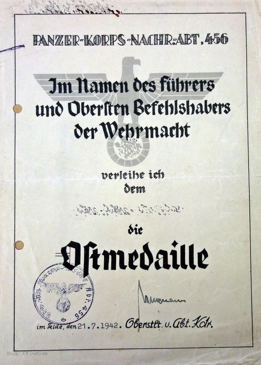 Dieses vorläufiges Besitzzeugnis ist interessant, da es sowohl auf die Stiftung der Ostmedaille eingeht als auch die genaue Verordnung in den Allgemeinen Heeresmitteilungen.