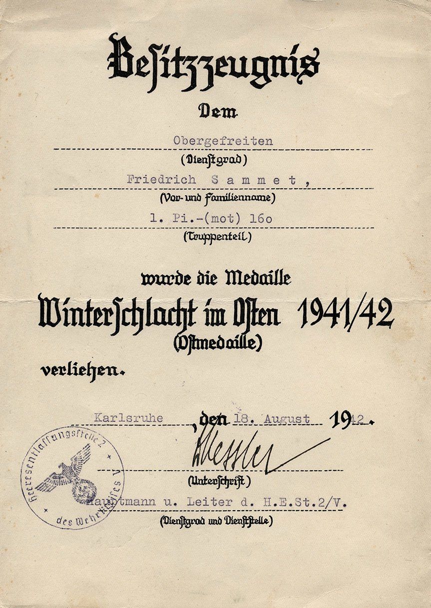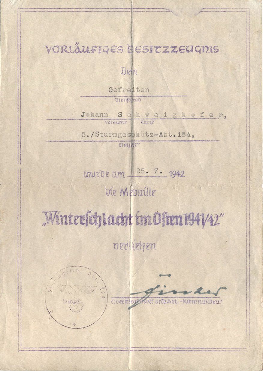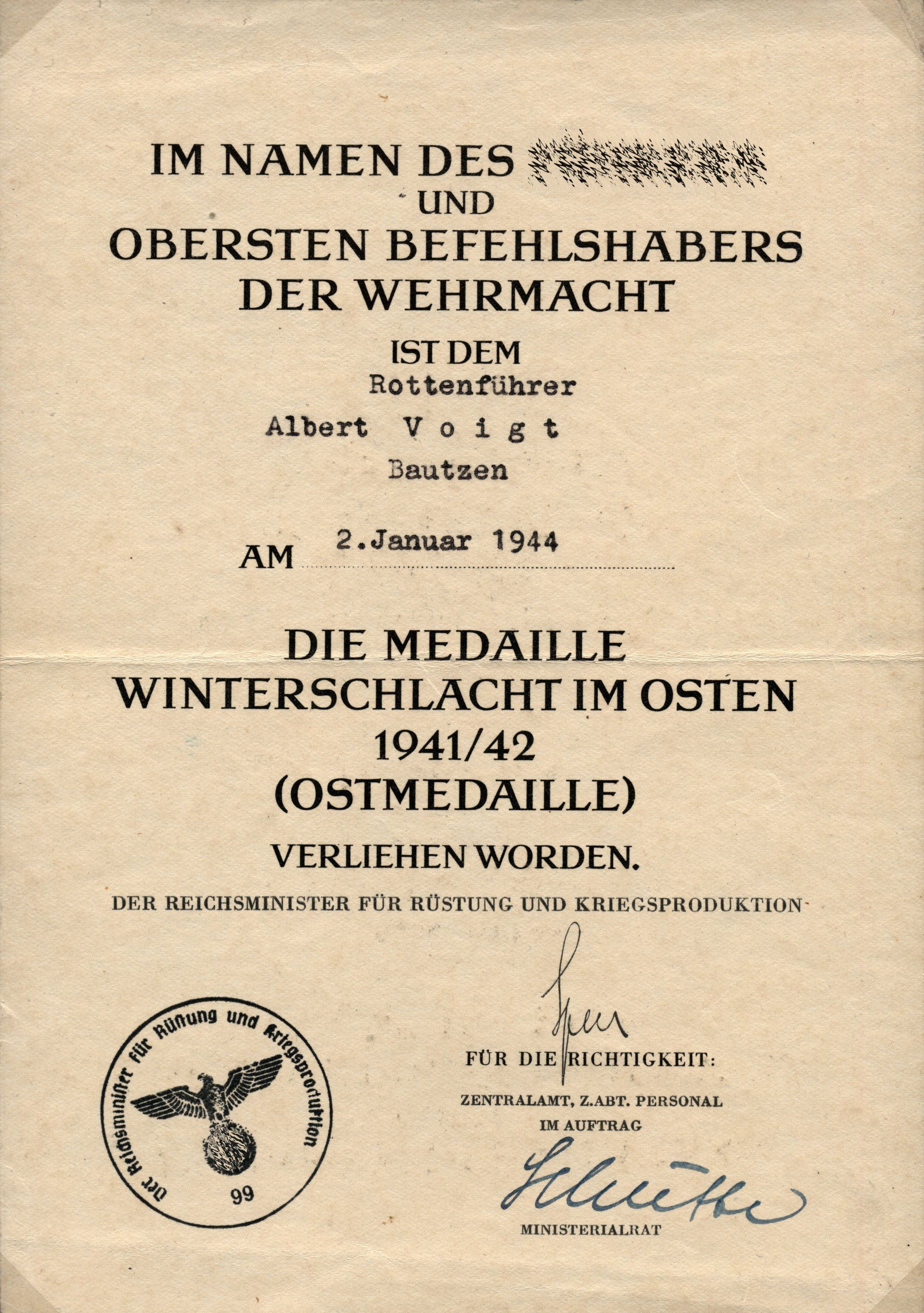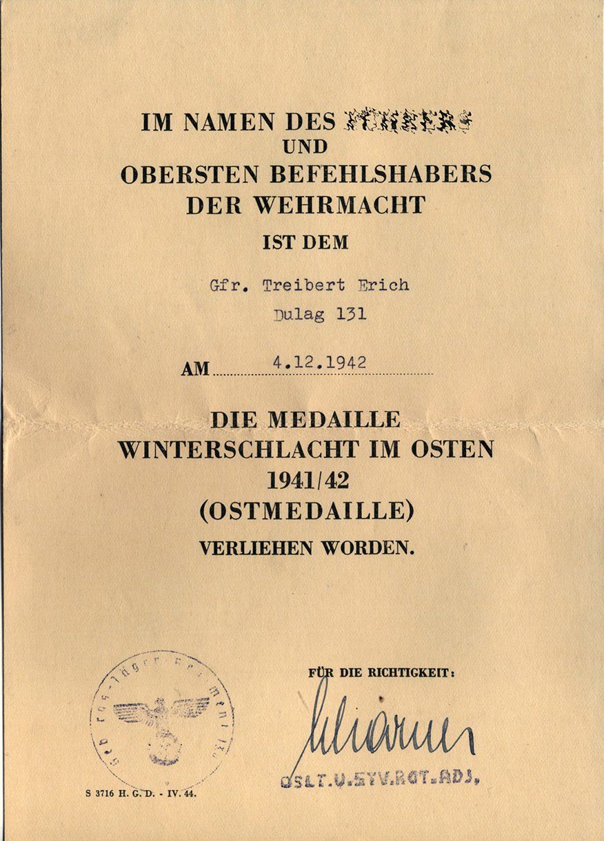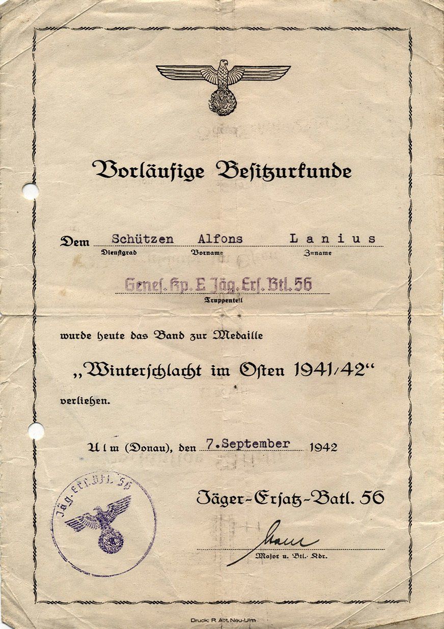 Dieses vorläufiges Besitzzeugnis ist interessant, da es sowohl auf die Stiftung der Ostmedaille eingeht als auch die genaue Verordnung in den Allgemeinen Heeresmitteilungen.
