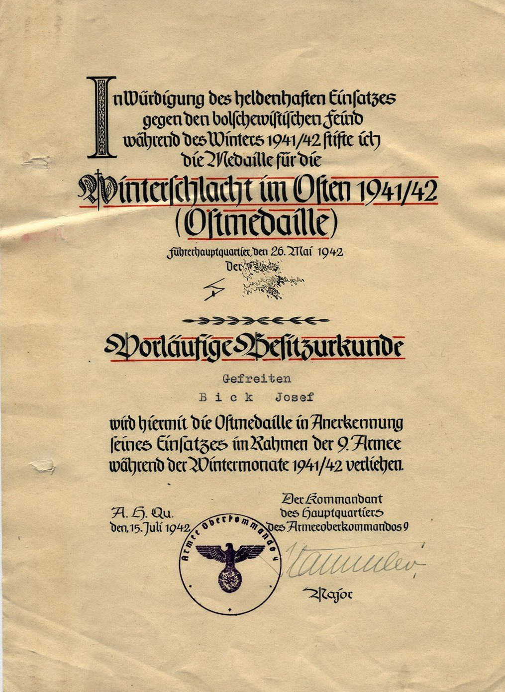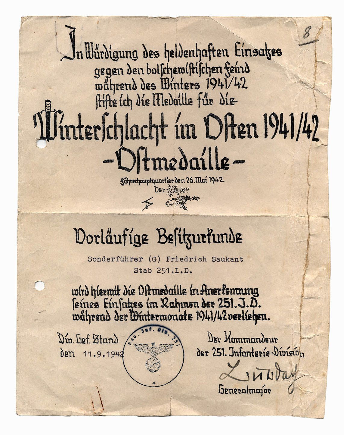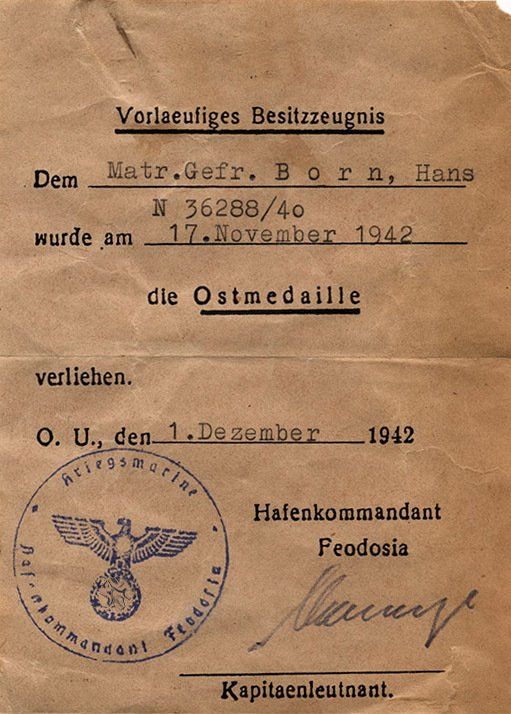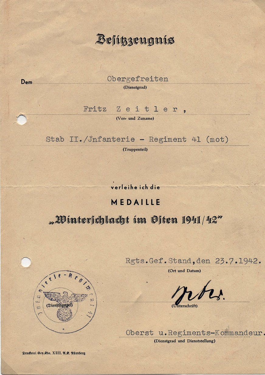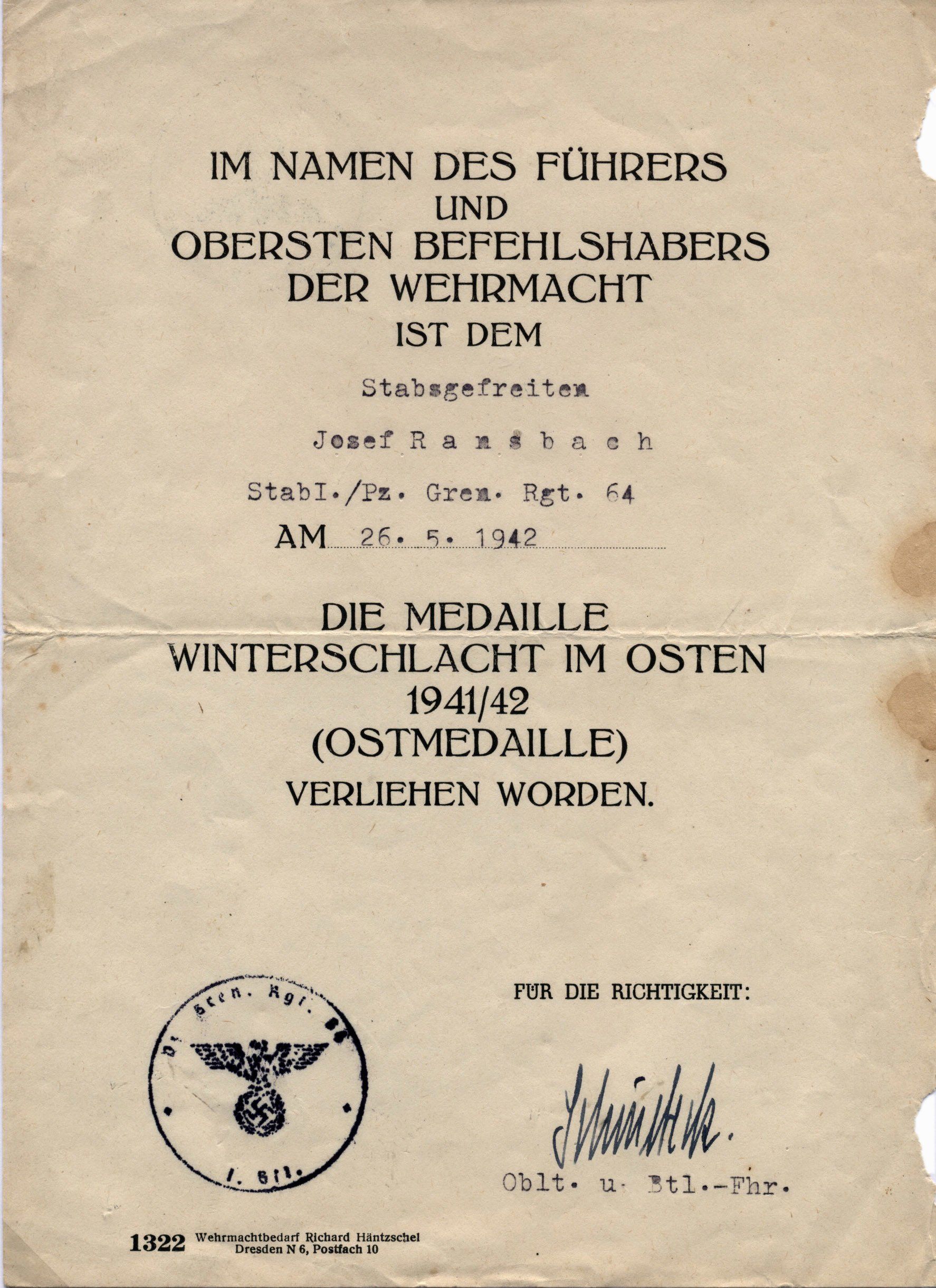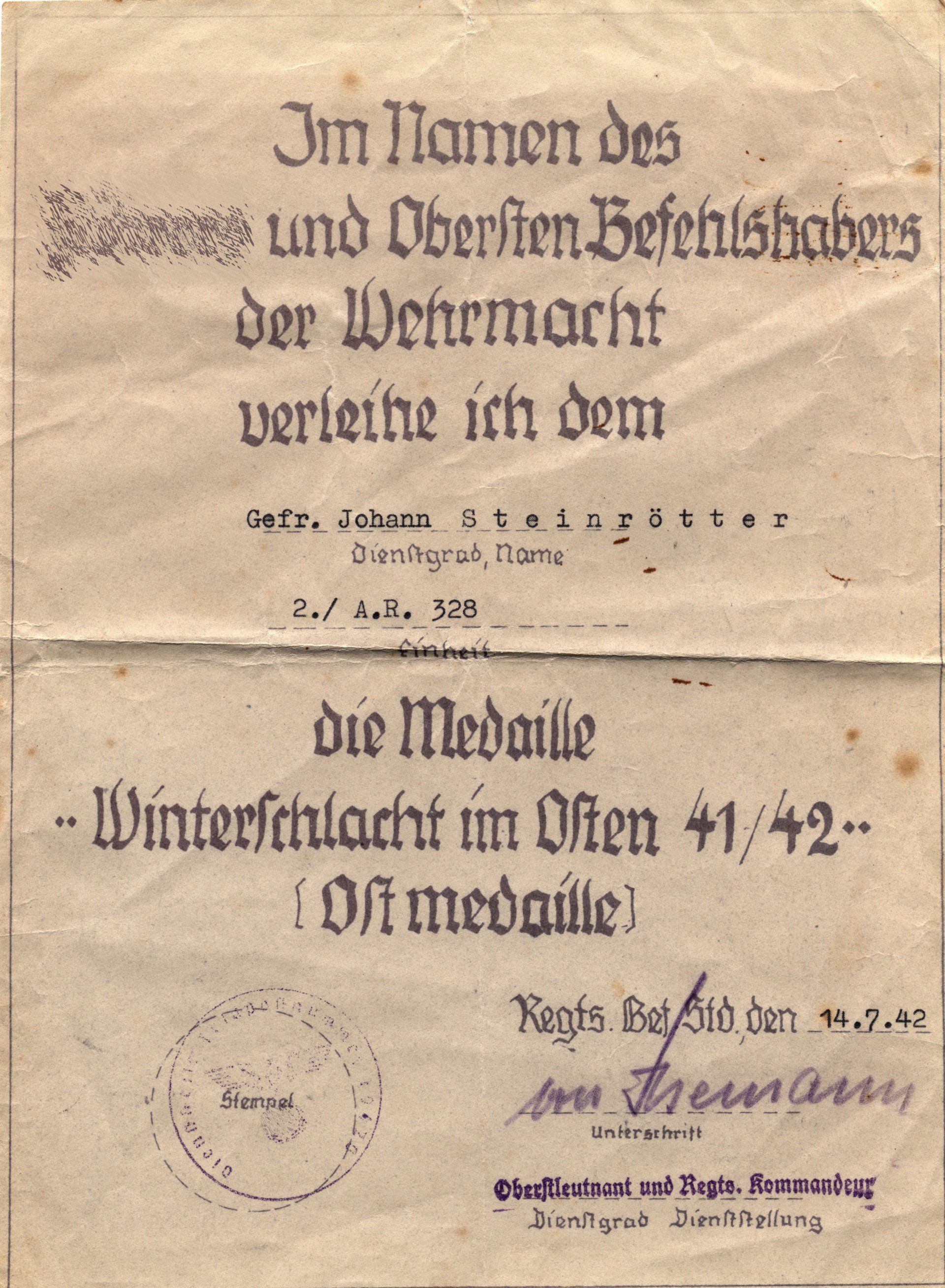 Dieses vorläufiges Besitzzeugnis ist interessant, da es sowohl auf die Stiftung der Ostmedaille eingeht als auch die genaue Verordnung in den Allgemeinen Heeresmitteilungen.