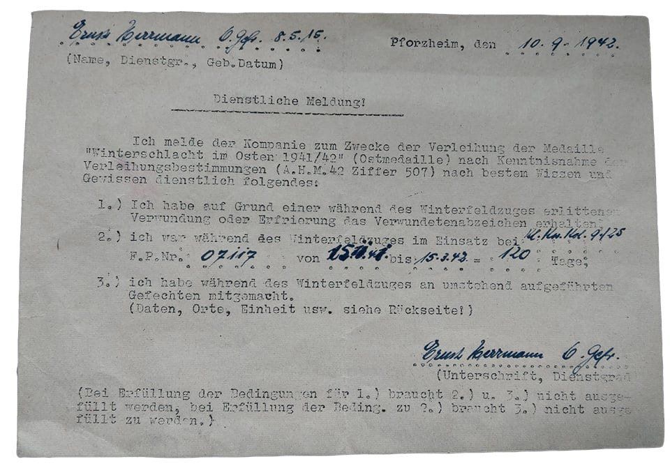 Für viele Auszeichnungen sind Anträge zur Verleihung bekannt. Dies konnten vorgedruckte oder mit der Schreibmaschine erstellte Formulare sein. Interessant ist die hier gezeigte dienstliche Meldung, bei der Soldat selbst Meldung darüber macht, dsas er die Verleihungsbedingungen zum Erhalt der "Medaille Windertschlacht im Osten" als erfüllt ansieht.