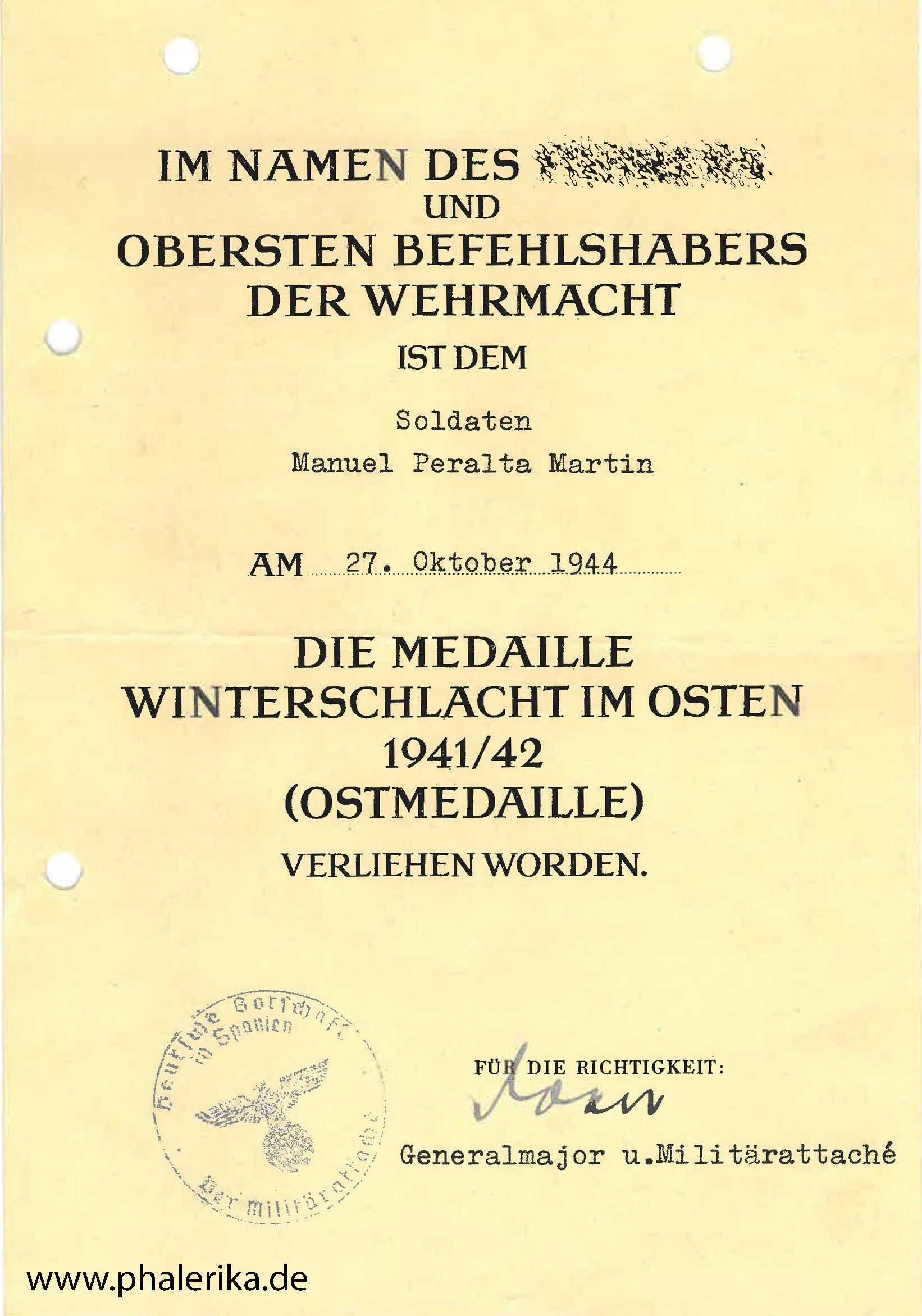 Hier eine Urkunden für einen Angehörigen der spanischen Freiwilligen. Interessant ist, dass die Urkunde durch die Deutsche Botschaft in Spanien ausgestellt wurde, und dass zu einem sehr späten Zeitpunkt. Bei diesem Standardvordruck kommen also viele Faktoren zusammen.