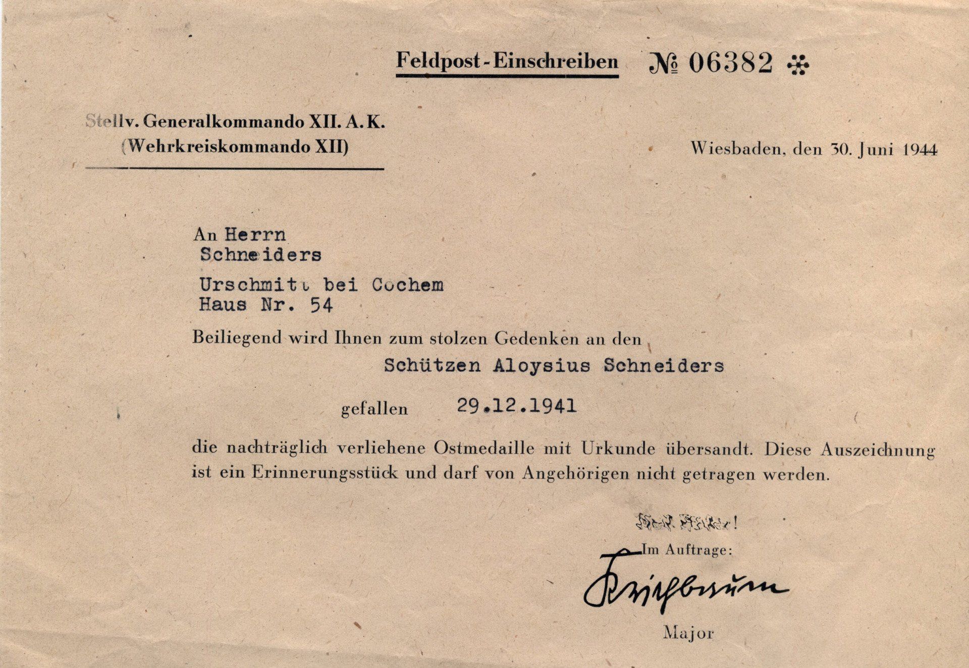 Hier ein weiteres Anschreiben für einen Gefallenen der bei den Kämpfen um Stalingrad verstorben ist.