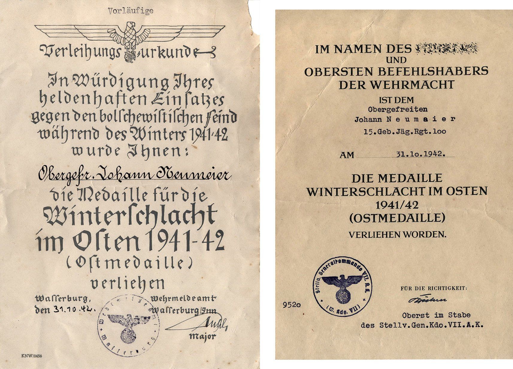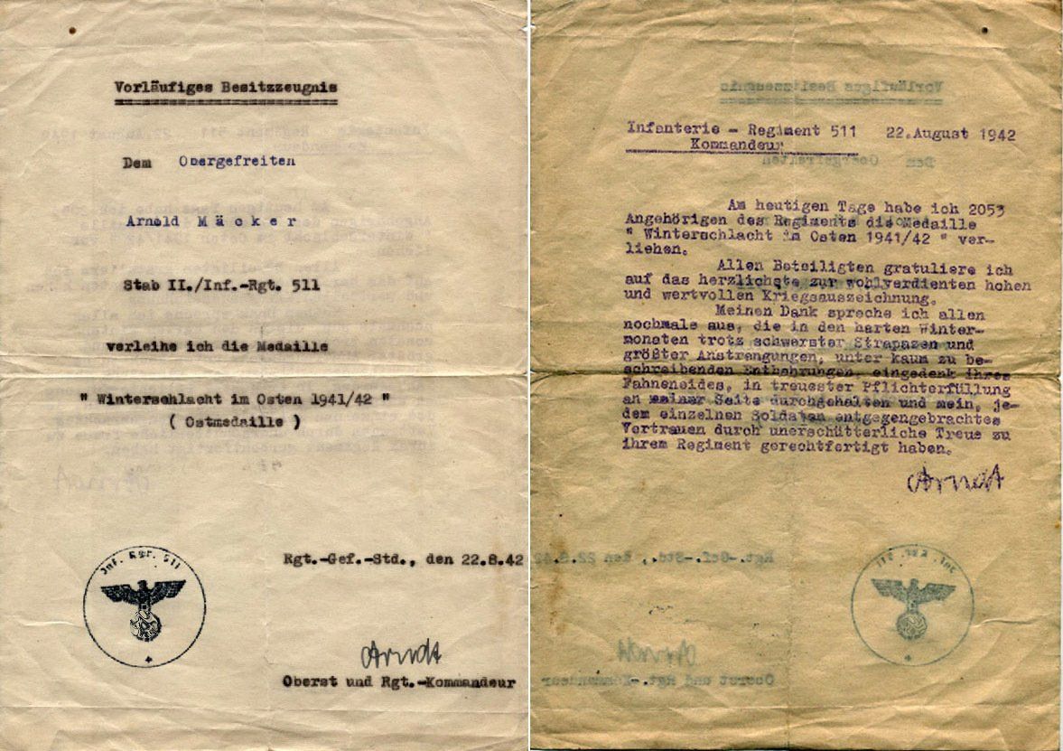 Meistens sind vorläufige Besitzzeugnisse ja eher einfach gehalten und maschinengeschrieben. Bei den Urkunden für die Ostmedaille findet man jedoch oft sehr aufwendig gestaltete Vordrucke. Möglicherweise standen am Anfang weder genug Urkunden noch Medaillen zur Verfügung und so haben einzelne Teileinheiten und Verbände selbstständig Urkunden hergestellt.