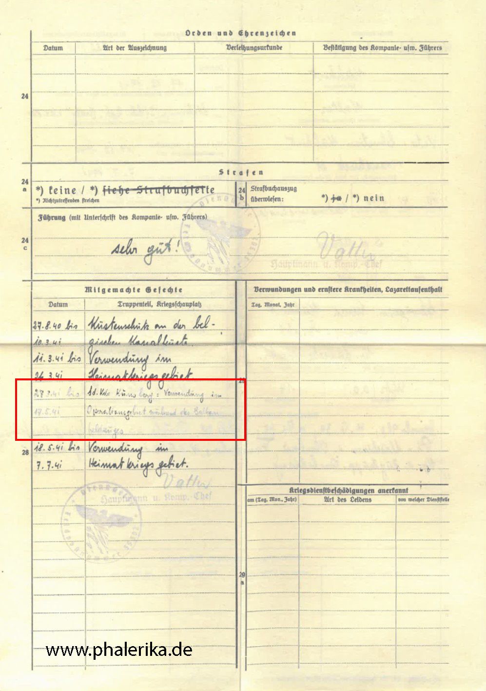 Bei der Auflistung der mitgemachten Gefechte ist besonders die Abkommandierung vom 27.03.1941 bis 17.05.1941 zum Sonderverband Künsberg interessant.