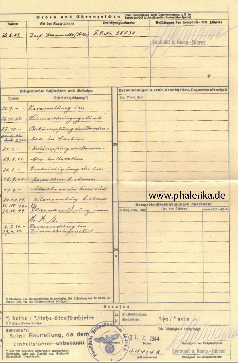 Wie diese letzte Kriegsstammrolle zeigt wechselte Walter innerhalb des 4. Regiments die Kompanie. Hier auch wieder interessant die Übersicht über die mitgemachten Gefechte wie Bekämpfung der Bandenbewegung in Serbien und Kroatien und die Abwehr an der Front südl. Klausenburg 6.Armee.