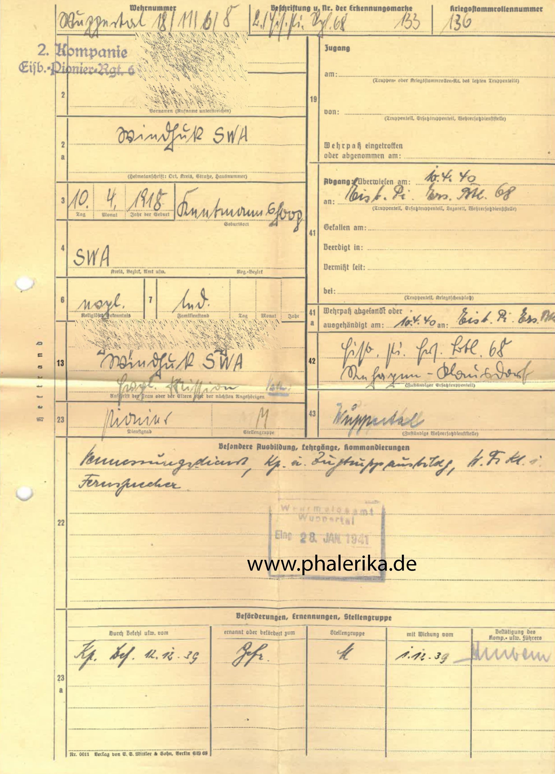 Wie der Auszug aus der Kriegsstammrolle zeigt wurde Walter während seiner Zeit im Eisenbahn-Pionier-Regiment 68 im Vermessungdienst ausgebildet, machte eine Kompanie- und Zugführerausbildung, sowie den Führerschein für die Wehrmachts-Kraftfahr-Klasse 1 (Motorrad) und eine Fernsprecherausbildung .