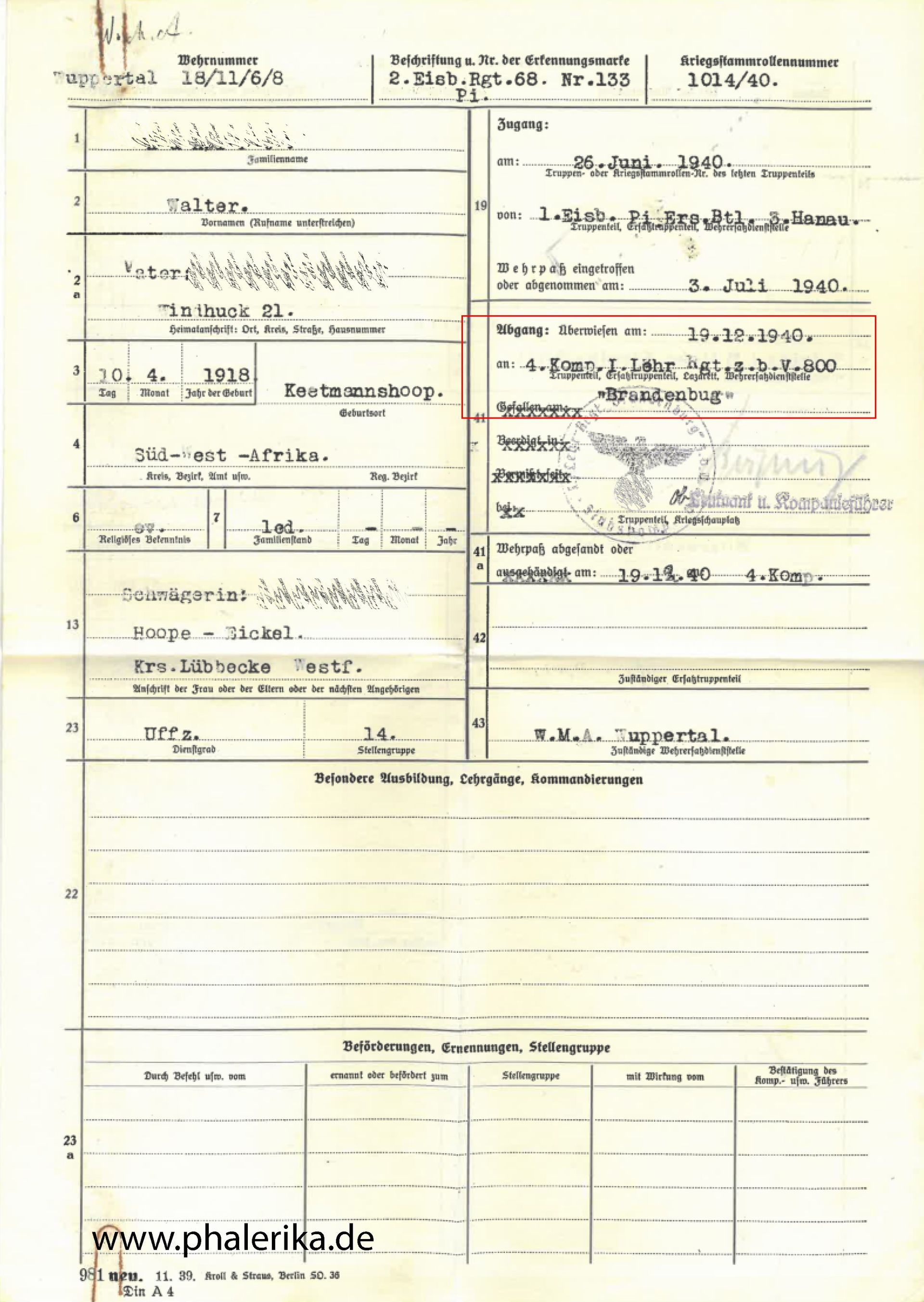 Auf den folgenden Seiten ist ein erster Hinweis auf Walters Verbindung zu den Brandenburgern, die bis Kriegsende andauerte.