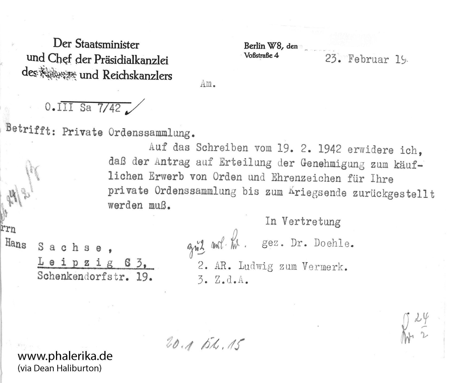 … Die Beschaffung von Orden, Ehrenzeichen und Ordensbändern für Ordenssammlungen ist daher nur möglich, wenn die Genehmigung hierzu erteilt ist. Zur Vermeidung eines unbefugten oder unerwünschten Erwerbs von Orden und Ehrenzeichen und auch aus anderen praktischen Erwägungen ist es ferner unbedingt notwendig, dass der Inhaber der Verkaufsstelle genaue Kenntnis erhält über den Umfang der erteilten Genehmigung. Eine allgemein gehaltene Genehmigung des Inhalts, dass ein Sammler ermächtigt wird, nach eigenen Ermessen Orden, Ehrenzeichen und Ordensbänder zu kaufen, wie er sie gerad benötigt, würde bei dem Verkäufer berechtigte Zweifel hervorrufen, ob die Abgabe der verlangten Auszeichnungen erwünscht und zulässig ist…