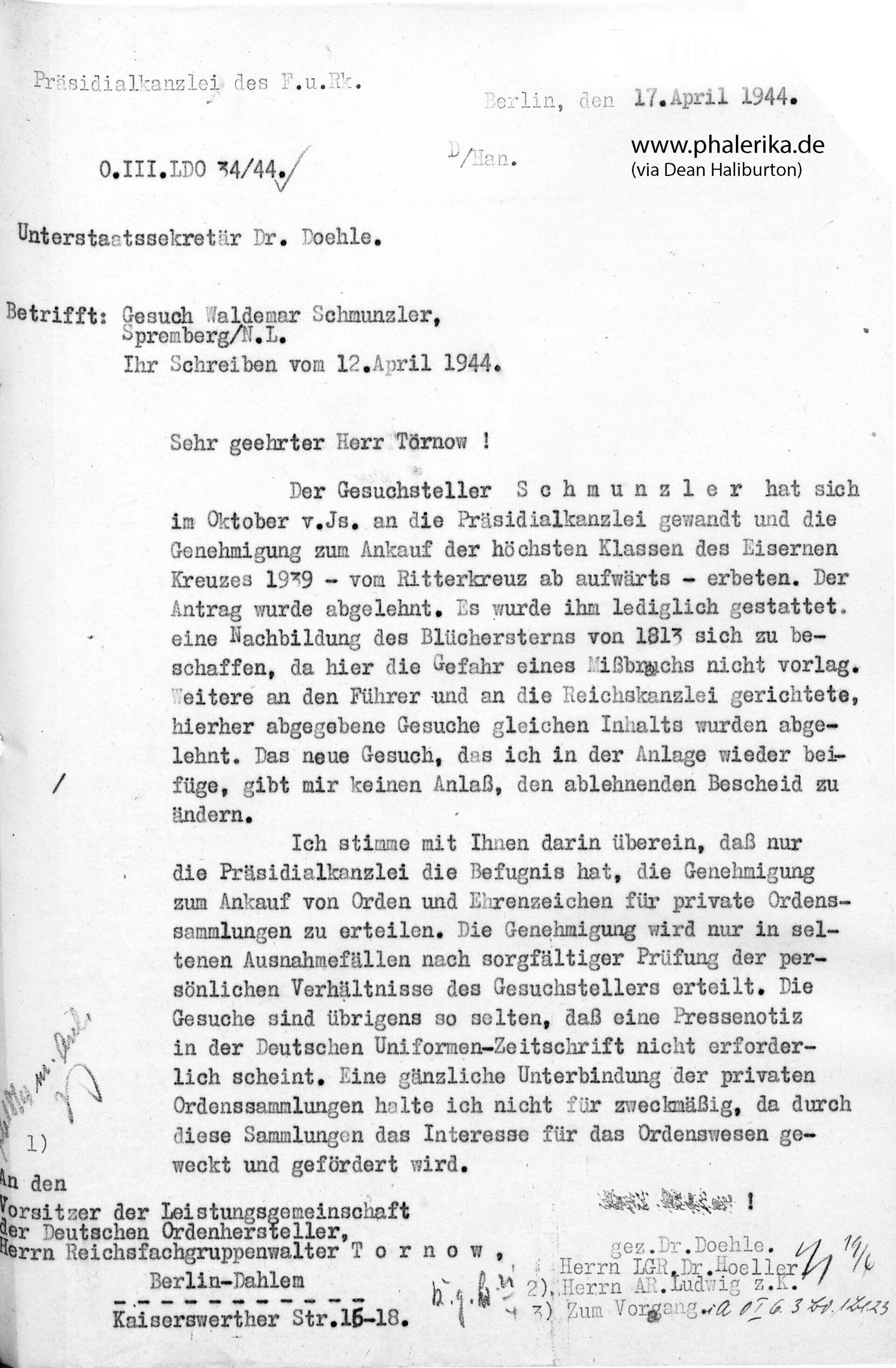 Das Antwortschreiben ist insofern interessant, als das hier unterschieden wird, dass die Anfrage für die verschiedenen Auszeichnungen an verschiedene andere Dienststellen zu erfolgen hat. Wie in Beispiel 2 gezeigt, wurde die Genehmigung zum Kauf von Kampfabzeichen durchaus auch von der Präsidialkanzlei erlaubt. Gut möglich das sich die Zuständigkeiten im Laufe der Zeit geändert haben.